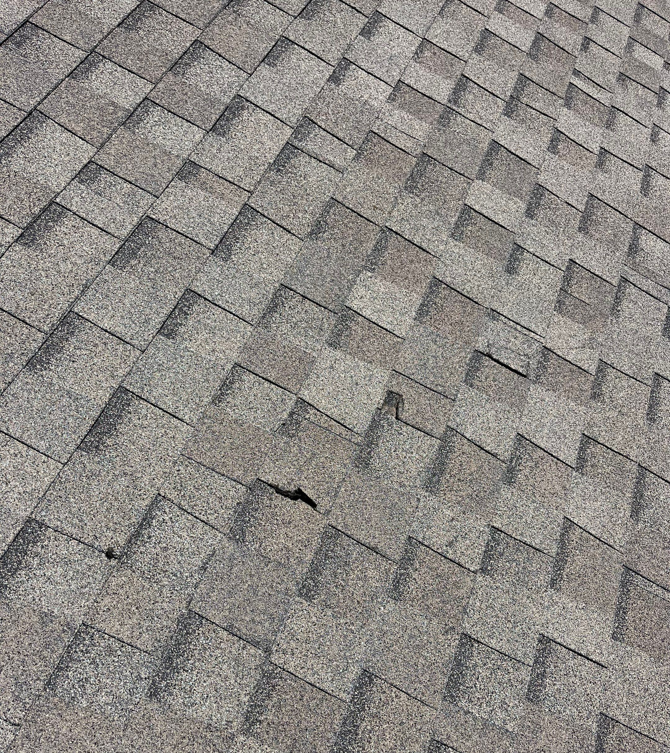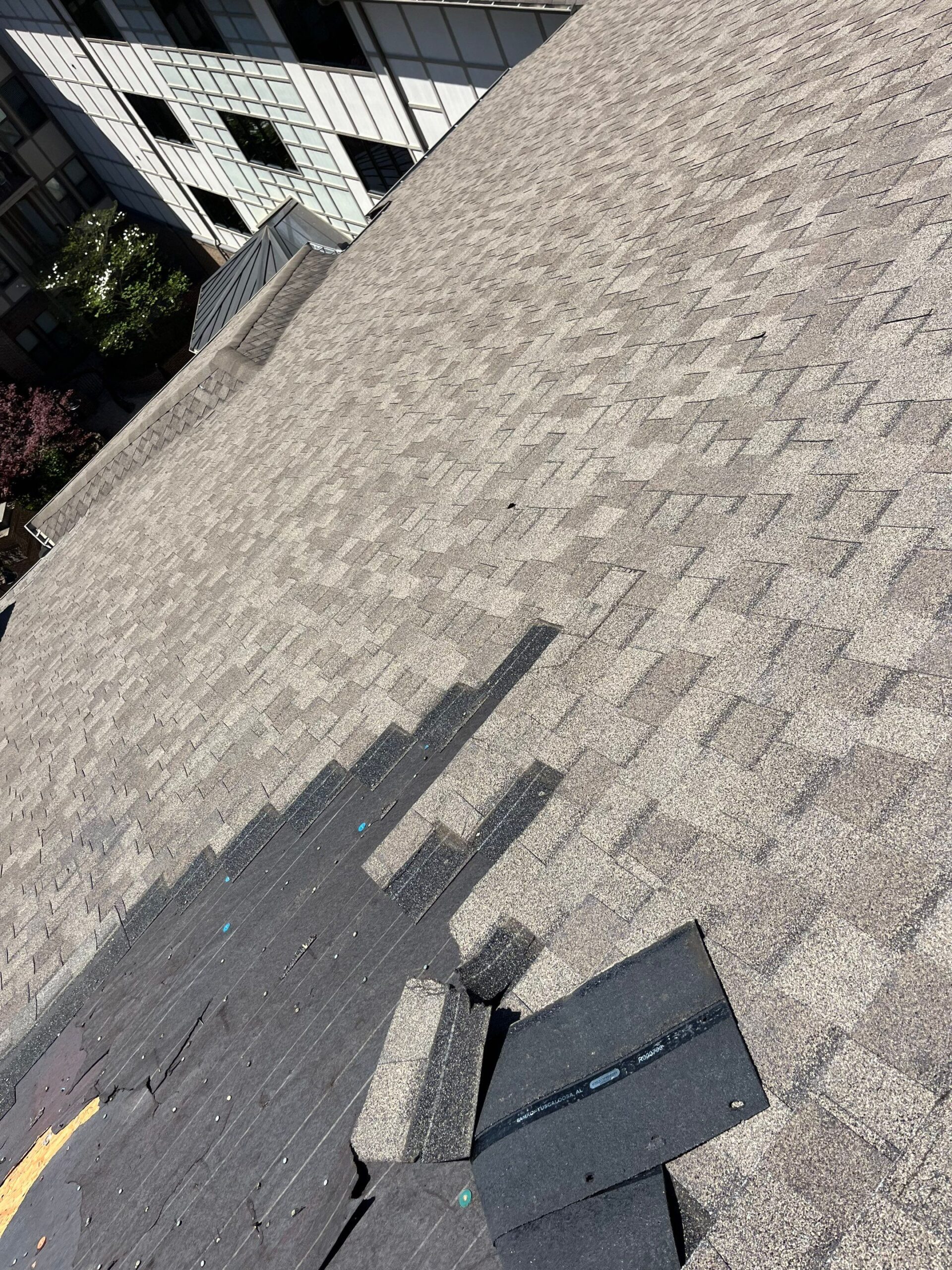 The condo roof shows more storm damage, with a smaller section of missing shingles concentrated near the roof's edge. Though the damage appears limited, it still poses a risk of water intrusion if left unaddressed. It's a reminder that even minimal shingle loss should prompt a call to a roofer near me for a timely inspection and repair.